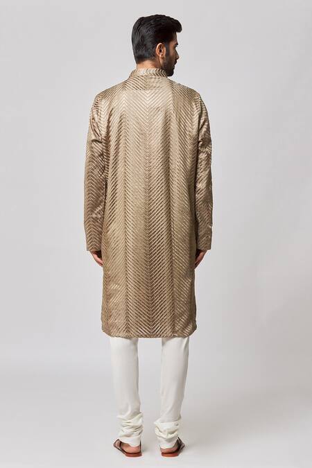 Brown cotton silk kurta with sequins embroidery and chevron pattern. Comes with cream churidar.