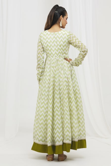 Green anarkali featuring chevron print with gota patti trims and mirror work on the yoke. Paired with a mirror work dupatta with cutwork border.