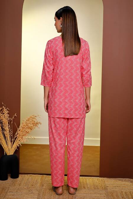 Peach Cotton Printed Bandhani Notched Chevron Top And Pant Set