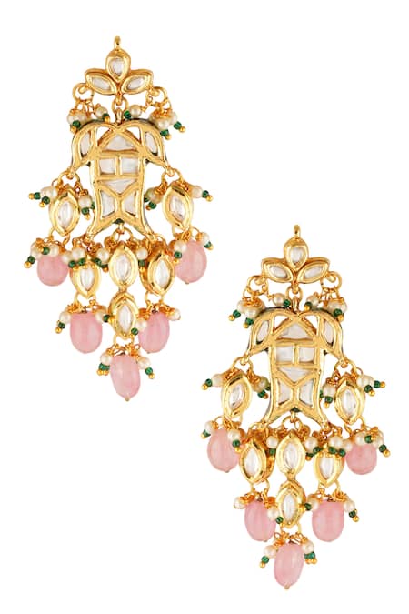 Carved motifs with intricate detailing, Multi bead drops in pink and green, Push back clasp for secure wear