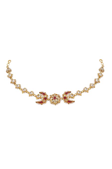 Gold plated sheeshpatti featuring floral and crescent motifs embellished with kundans and pink stones
