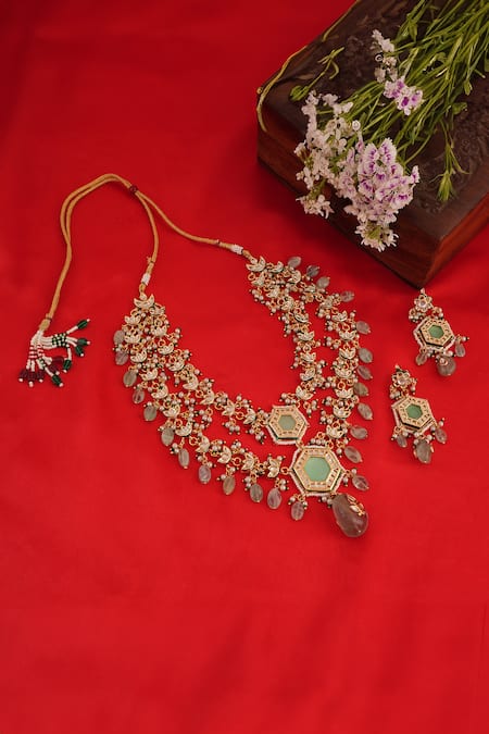 Gold plated long dual layered necklace featuring hexagon shaped jade stones and dangling stone studded units. Paired with a matching pair of dangler earrings adorned with similar jade and kundan embellishments.