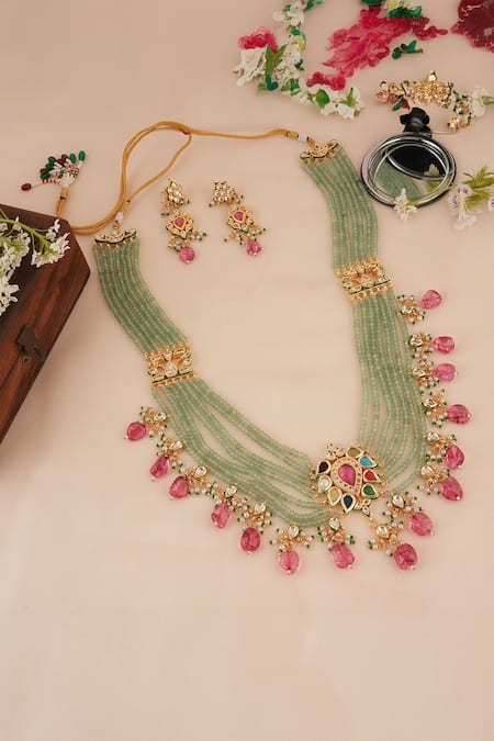 Floral kundan and polki studded units, Dangling pearls and colored beads, Multi-layered design for a dramatic effect