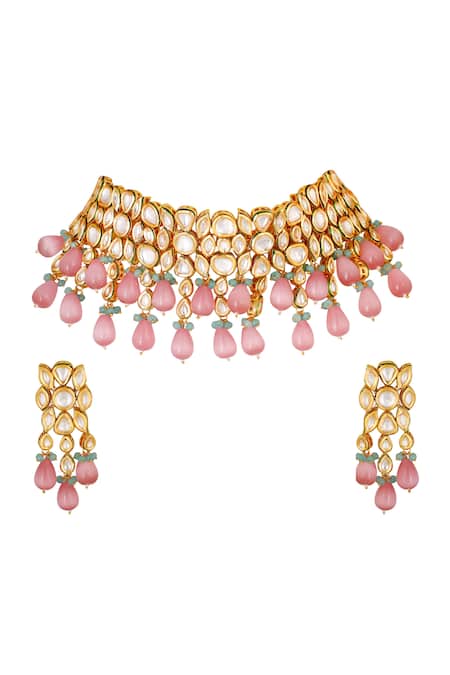 Gold choker featuring encrusted kundan with pink and green tiered cluster bead drops. Paired with matching dangler earrings adorned with similar bead designs.