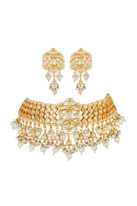 Gold-plated choker adorned with encrusted kundan, teardrops, and cluster pearls. Paired with matching earrings featuring danglers and push back clasp.