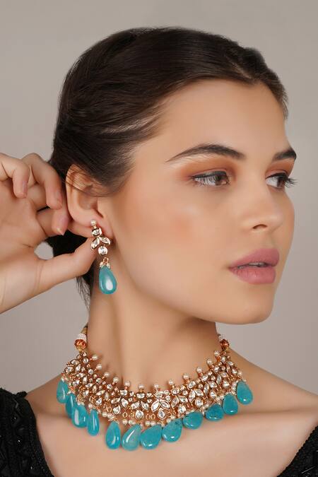 Blue Stones, Pearls, Diamonds Kundan Embellished Choker Necklace Set