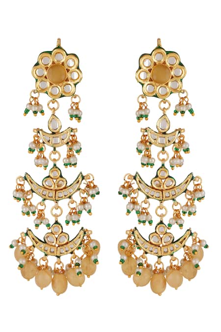 Yellow Stones, Pearls, Diamonds Kundan Embellished Layered Dangler Earrings