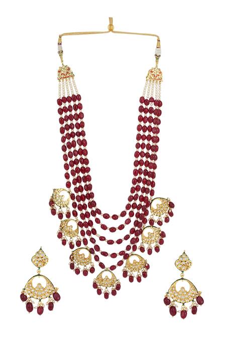 Maroon multi-strand necklace featuring intricate gold plated carvings and stone drop details. Paired with matching chandbali earrings adorned with beads and Kundan work.