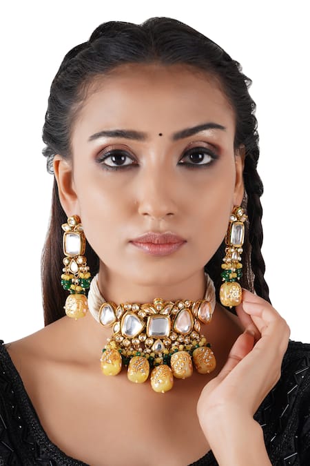 Clusters of yellow and green beads, Kundan bead drop design, Gold plating with intricate detailing