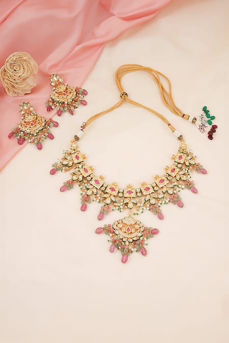 Dangling pearl trinkets on necklace, Floret shaped design elements, Pink-green toned stones embellishments