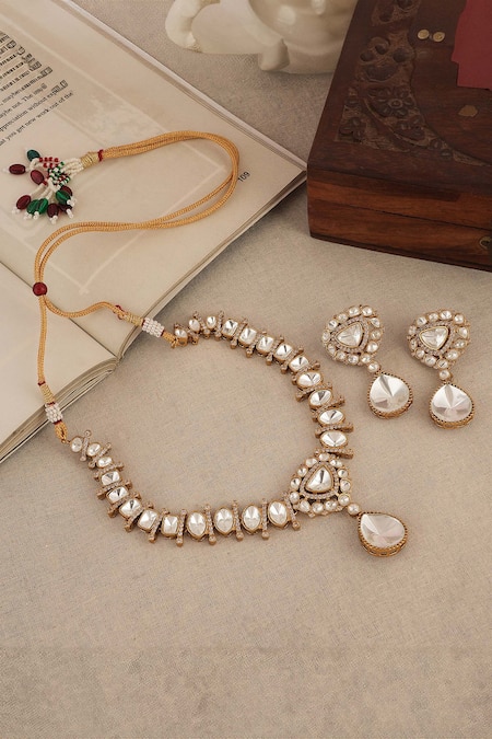 Buy_ChhavI'S Jewels_White Piping, Stones Pretty Pear Kundan And Polki Studded Jewellery Set _Online_at_Aza_Fashions