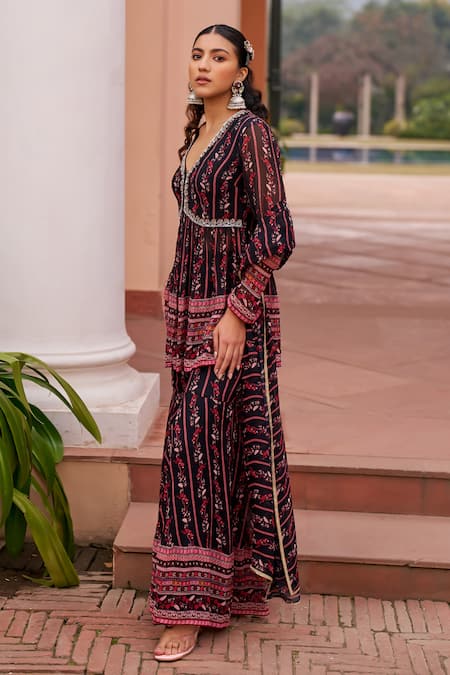 Black peplum kurta featuring botanic and stripe print with placed sequin threadwork. Paired with a matching sharara and scallop lace lined dupatta.