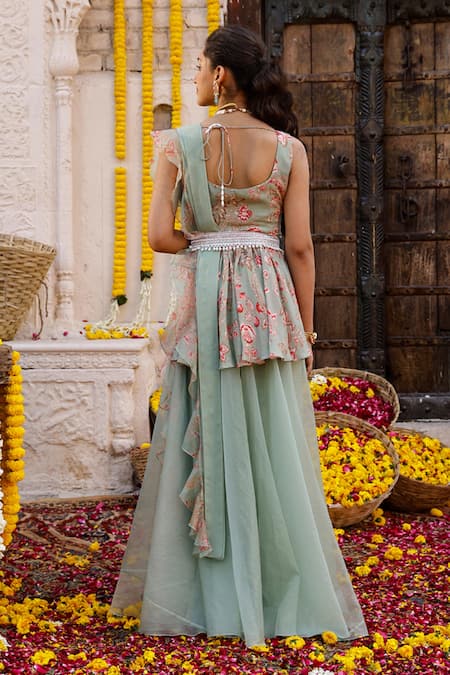 Sage green kurta with all-over floral printed motifs, embroidered yoke in dabka & sequin work. Paired with flared palazzo & printed ruffle hem dupatta. Comes with hand embroidered belt.