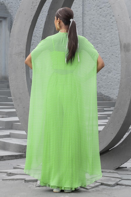 Green Georgette, Linen Pearls Sweetheart Neck, Geometric Print Cape Sharara Set