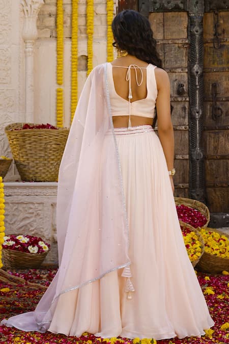 Light peach lehenga with gathered detailing & ruffle hem. Paired with embroidered blouse in sequin & dabka work. Comes with tasseled hem dupatta.