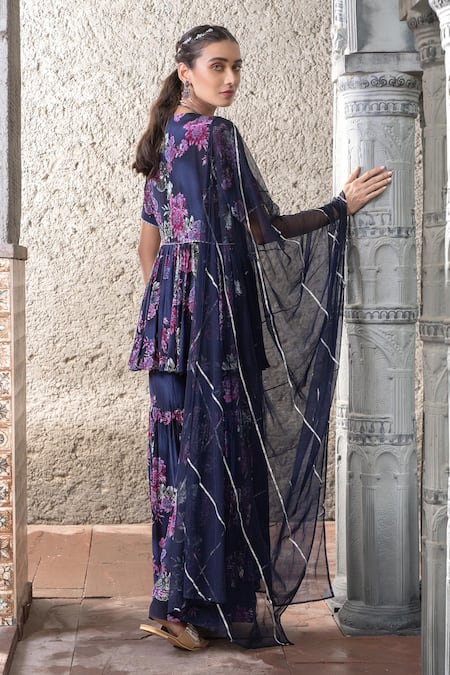 Navy peplum jacket featuring botanical print, cut dana, sequin & thread work. Paired with a printed tiered sharara and dupatta with striped gota work.