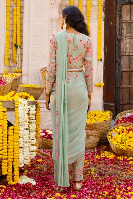 Sage green pre-draped pant saree with floral printed motifs. Paired with floral printed blouse with embroidered neckline in dabka & sequin work. Comes with an embroidered belt.