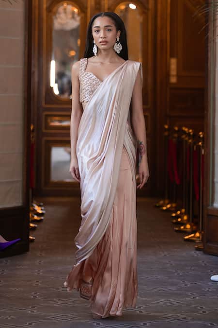 Beige pre-stitched saree featuring a pleated pallu. Paired with a sleeveless blouse adorned with zardozi and cutdana embroidery.
