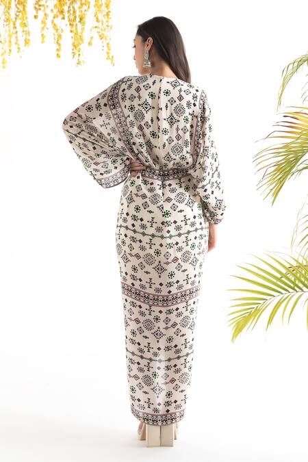 White Crepe Geometric Print V Neck Kaftan Dress