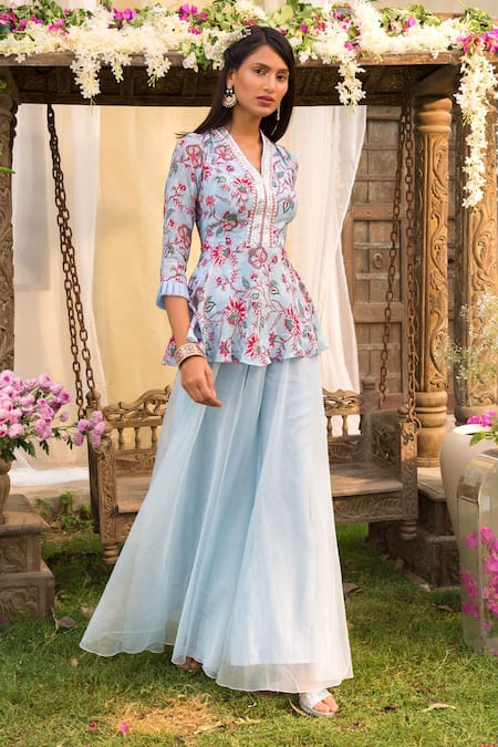 Powder blue peplum top with all-over floral print, embroidered neckline and frill detailing at the sleeves. Comes with organza palazzo.