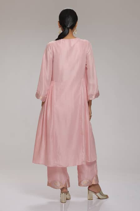 Buy_Chhaya Mehrotra_Pink Habutai Silk, Brocade Floral Keyhole Kurta And Pant Set _Online_at_Aza_Fashions