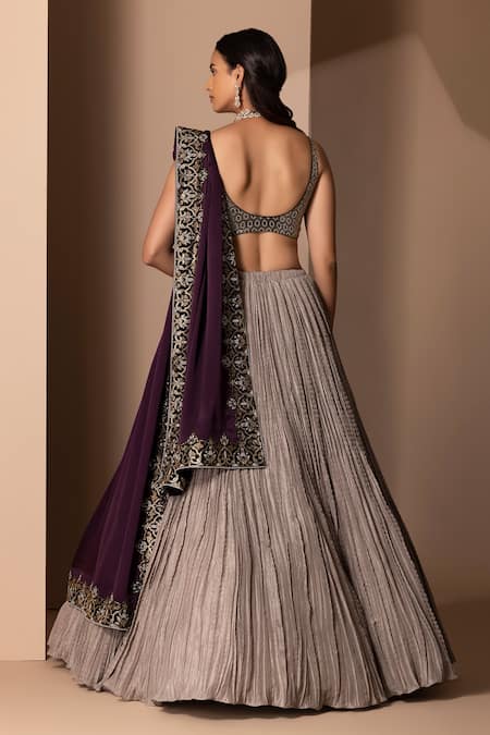 Grey lehenga with crushed texture & side tassel tie-up. Paired with rhinestone embellished silk satin blouse & silk satin embellished contrast dupatta.