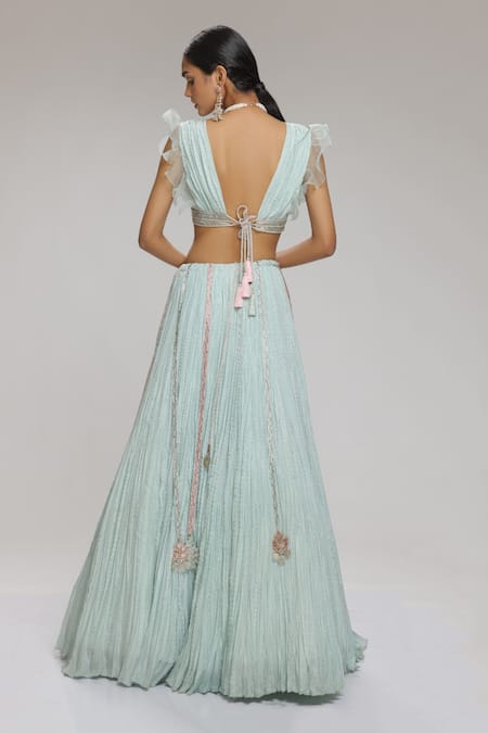 Mint lehenga with crushed pattern. Paired with rhinestone detailing on blouse & dupatta.