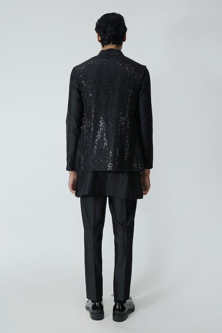 Black chanderi bundi featuring tonal rhinestone embellished geometric motifs. Paired with an embellished placket kurta and matching pant.