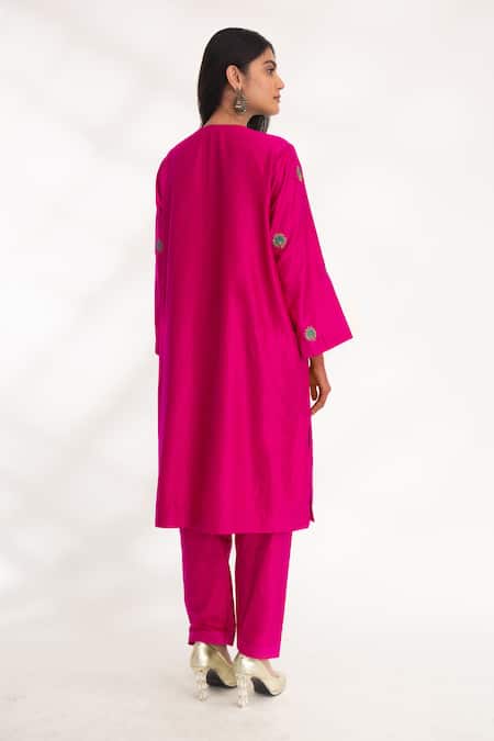 Magenta kurta featuring full sleeves and V neckline with zardozi embroidery in peacock pattern. Paired with straight pants in matching color.