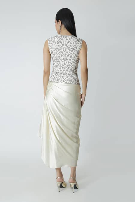 Ivory waistcoat featuring multicolour rhinestone embellished floral motifs and welt pockets. Paired with a solid draped skirt made of silk satin.