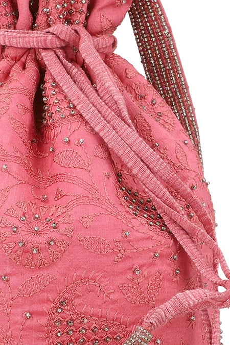 Pink Embroidery, Beads Floral Potli Bag