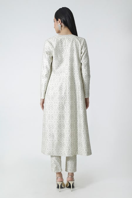 Buy_Chhaya Mehrotra_Ivory Brocade, Chanderi Rhinestones Plunge Neck, Embellished Jacket Pant Set _Online_at_Aza_Fashions