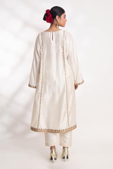 Ivory Zari Round Neck Kanak Zardozi Embroidered Kurta And Pant Set