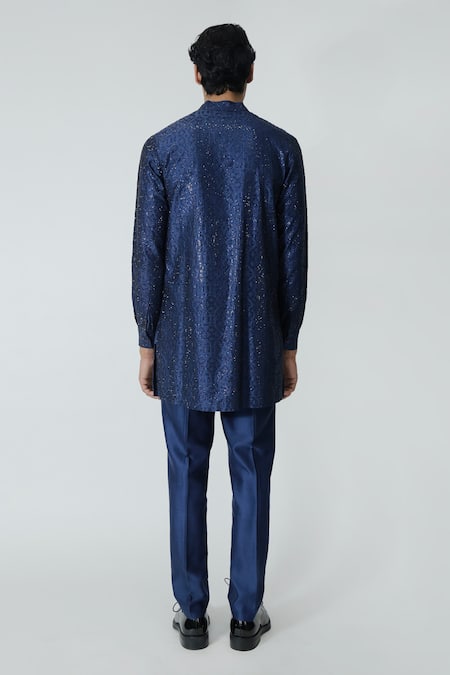 Navy blue chanderi kurta featuring full sleeves and a band collar with rhinestones embellished geometric pattern detailing. Paired with coordinating solid pant with attached side pockets.