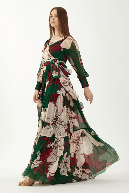 Green, red and off white tiered dress in chiffon base with all over floral pattern.