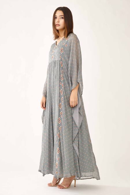 Blue gathered kaftan with V neckline, flared sleeves & geometric print.