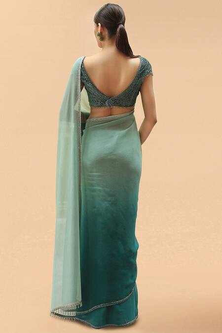 Ombre green saree with crystal border. Comes with crystalized blouse & petticoat.