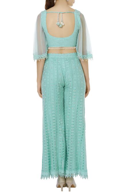 Crystal and bead work aqua blue hued chikankari net crop top and palazzo pant.