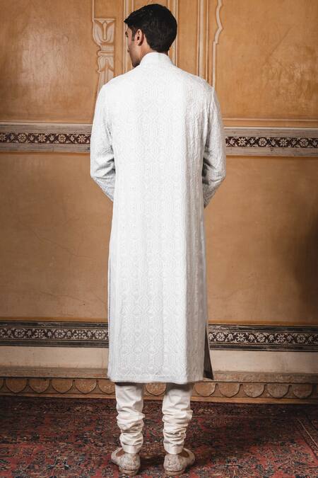 Blue kurta with all over chikankari embroidery. Comes with white churidar.