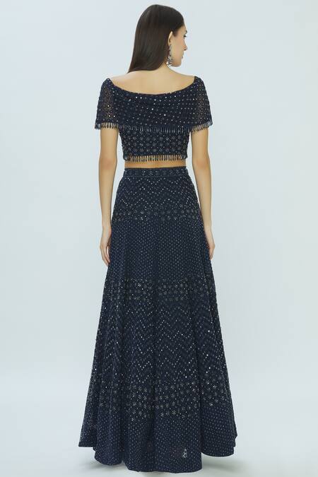 Midnight blue lehenga with embroidery all over. Paired with asymmetric layered blouse & dupatta.