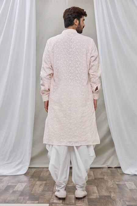 Pink georgette kurta enhanced with all over chikan and sequin embroidery. Paired with a white dhoti pant.