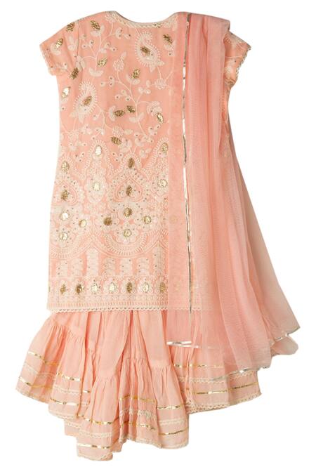 Peach Lucknowi kurta with all over chikan embroidery. Comes with sharara pants & dupatta.