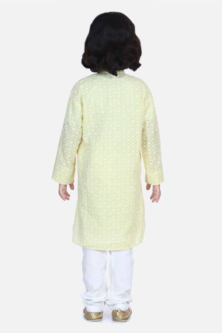 Lemon yellow, white threaded chikankari kurta with applique details on front placket. Paired with an off-white pyjama.
