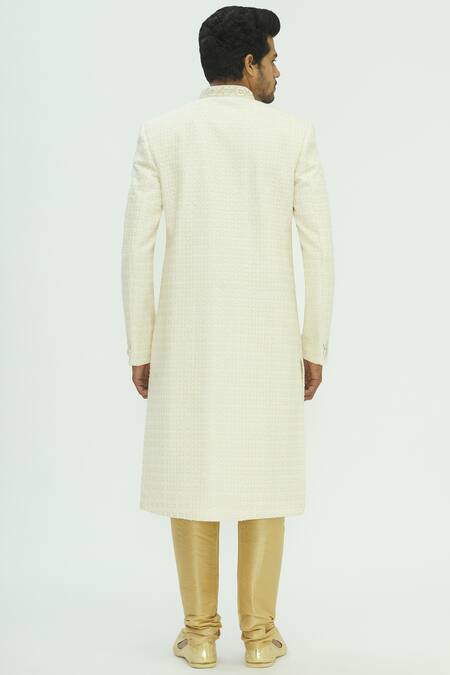 White sherwani with chikankari embroidery & embellished band collar. Comes with gold churidar.