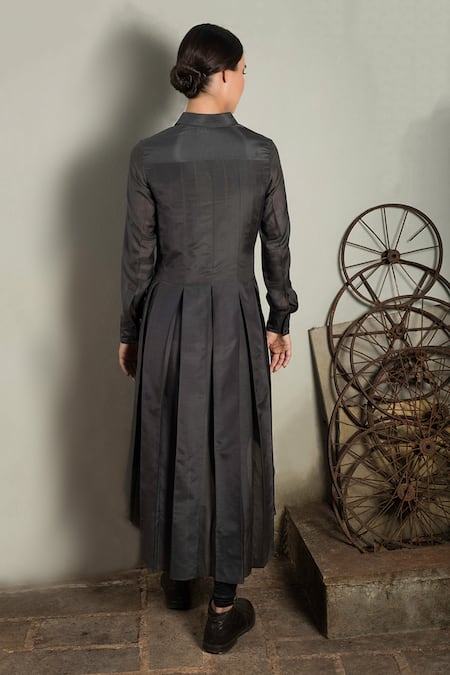Grey Cotton Silk Shirt Collar Asymmetric Tunic