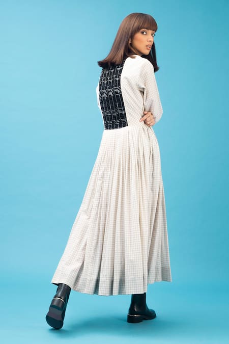 Off white checkered maxi dress with back fabric manipulated detail & front zipper.