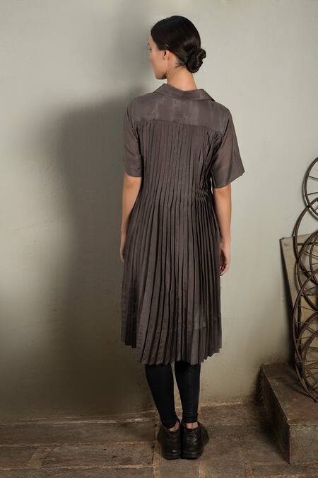 Grey Cotton Silk Spread Collar Pleated Tunic