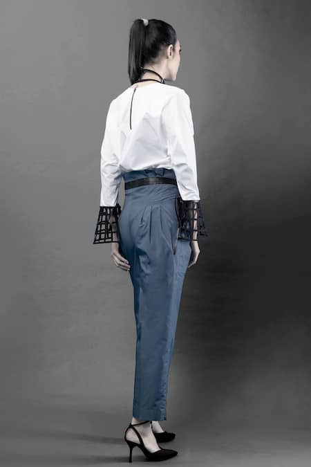 Blue Poplin Straight Pant With Belt