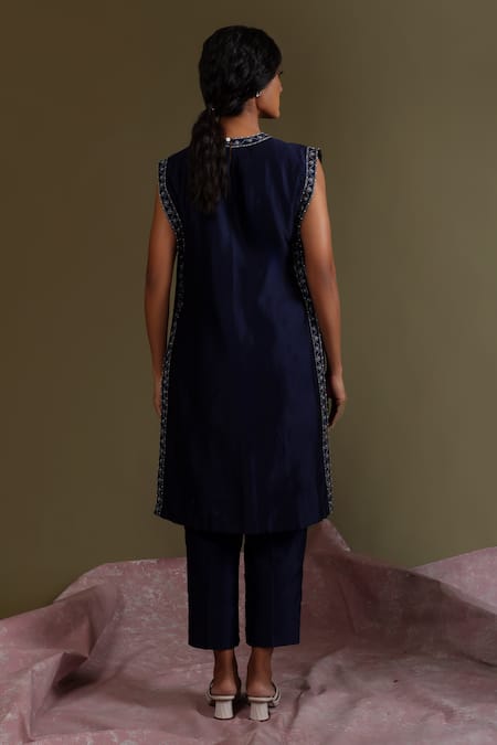 A deep blue straight-fit kurta crafted from silk chanderi, featuring zari embroidery along the neckline and side seams, framing a rectangular silhouette. It comes with an attached lining. Paired with coordinating straight-fit pants made from silk chanderi.