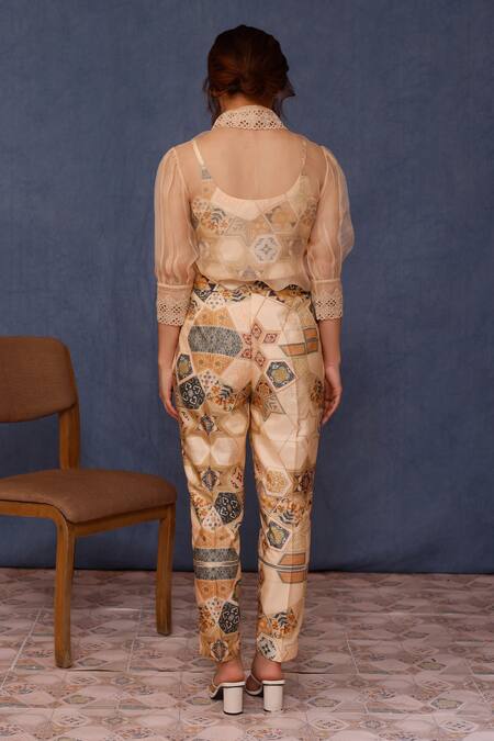 Beige sheer shirt with cutwork embroidered neckline and cuffs. Paired with a Moroccan tile print top and pencil fit pant.